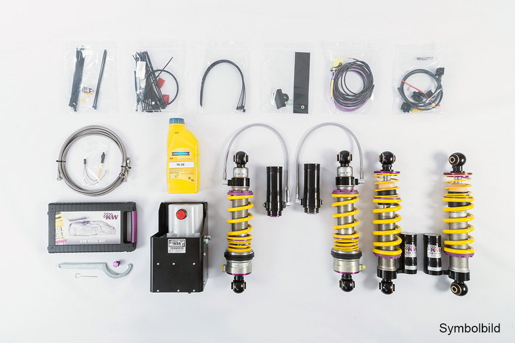 Das KW HLS Lift Kit gibt es als komplette Fahrwerklösung in Kombination mit einem KW Gewindefahrwerk oder auch als Nachrüstsatz für serienmäßige Fahrwerke sowie KW Gewindefahrwerke, bestehend aus Federn, Adaptionen, Hydraulikzylinder und kompletter Steuerung.